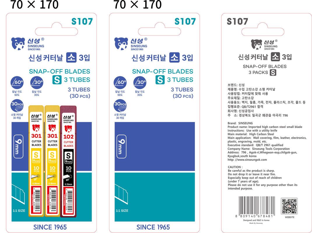 Każdy zestaw kart blisterowych Sinseung S107 zawiera 2 opakowania ostrzy S301 i 1 opakowanie ostrzy S102, w sumie 30 ostrzy w zestawie.specjalnie zaprojektowany do noży użytkowych i kompatybilny z większością noży 9 mm na rynkuUżytkownicy mogą przeciągać ostrze S301 do 8 razy, a ostrze S102 do 12 razy, dzięki czemu łatwo usuwać ciemne segmenty wzdłuż głębokiej linii rowu, aby ujawnić świeże, ostre krawędzie.Ta przyjazna dla użytkownika funkcja pozwala zaoszczędzić czas podczas cięcia.